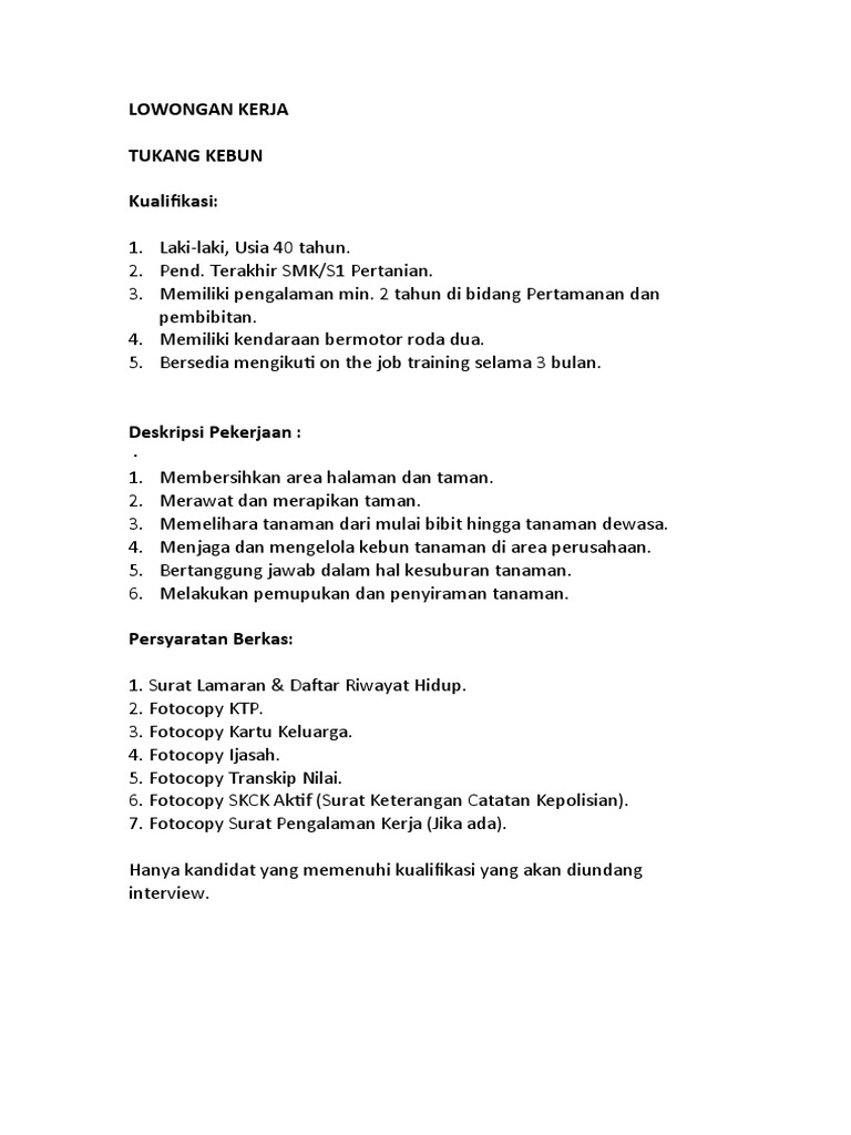 Listed 2 days ago 2022-07-12 on wwwmudahmy Find similar jobs to Tukang Kebun. Inilah contoh job description tukang kebun dan hal lain yang berhubungan erat. Apply for TUKANG KEBUN - Hiring Immediately at Chong Tsin Full today.